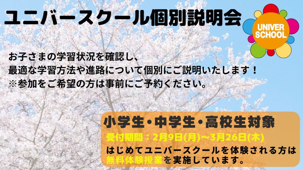 | 最新の情報は 公式ラインにご登録を! LINE 友だち追加 ユニバースクールの情報を 公式ラインでお届けいたします! 入塾に関するご質問なども公式ラインより 簡単にお問い合わせいただけます! | 毎日の授業の様子を公開中! 公式インスタグラム フォローよろしくお願いいたします! ![]() |