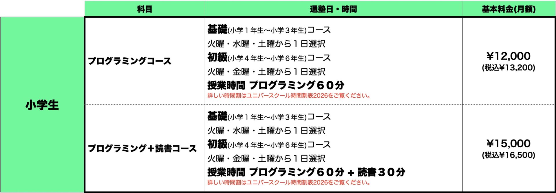 授業スケジュールと授業料
